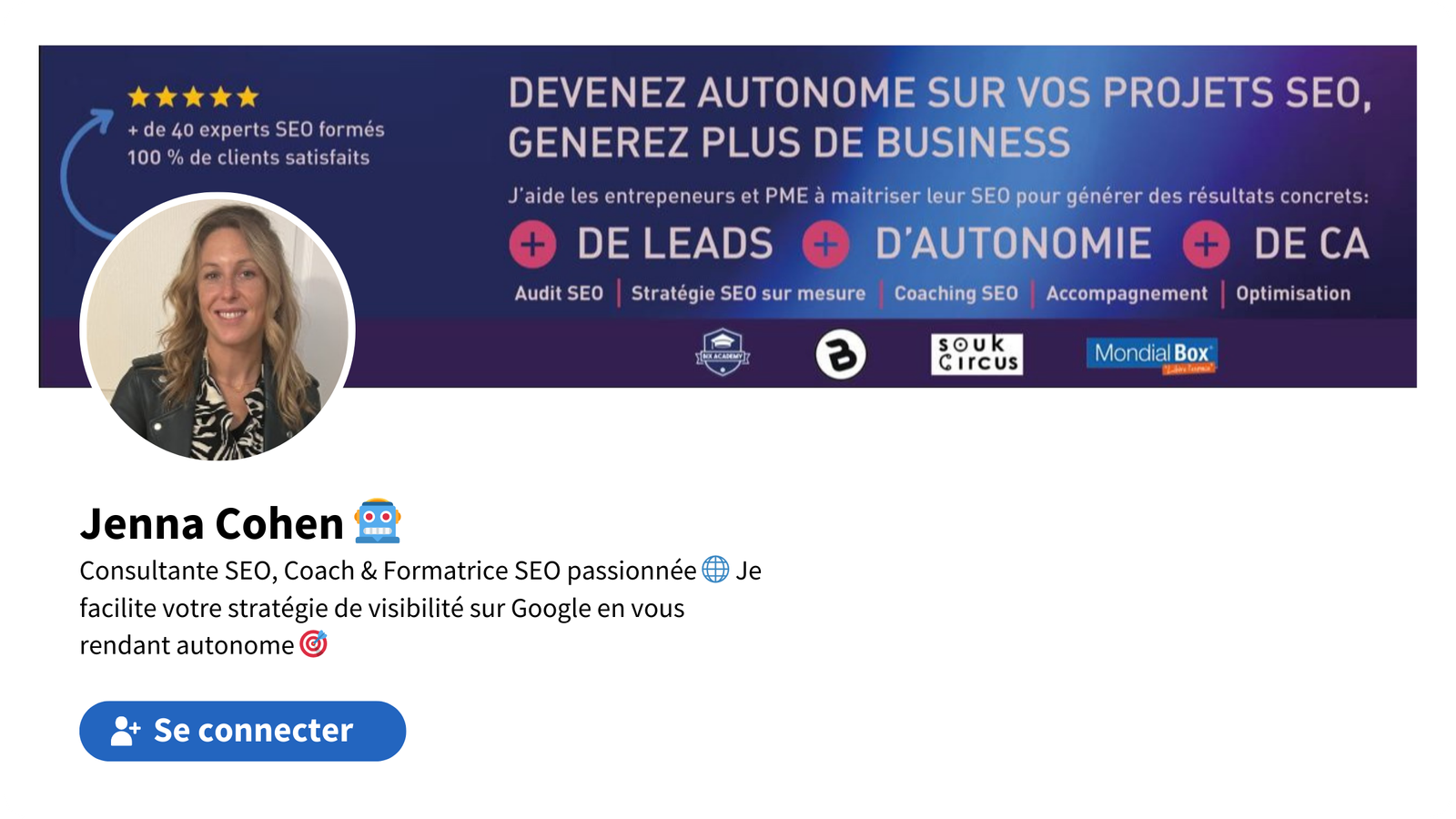 Il a retravaillé toute mon identité visuelle sur LinkedIn : une vraie transformation qui reflète enfin mon positionnement et l’énergie que je mets dans mes accompagnements SEO.